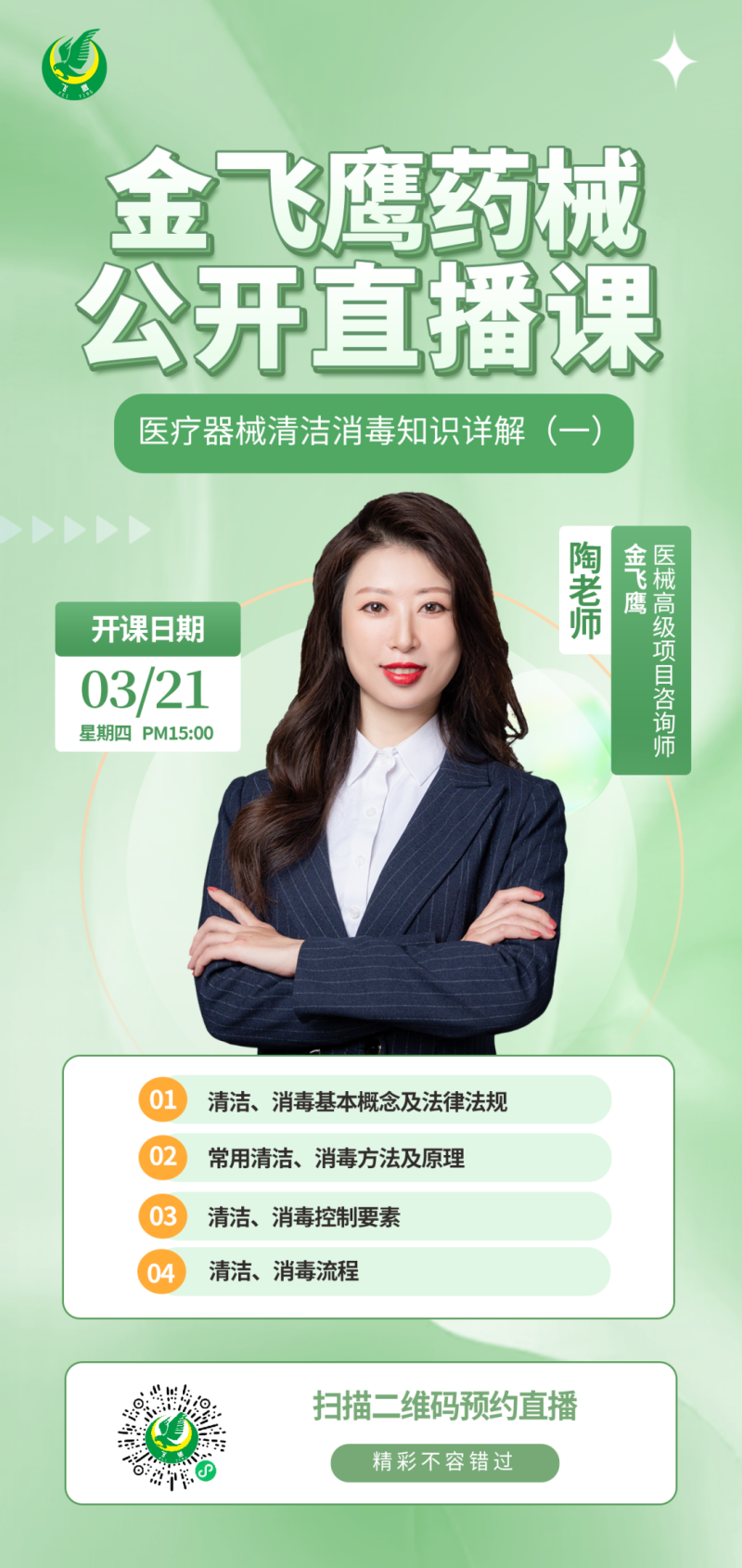 3月21日下午3點,金飛鷹高級項目咨詢師,負責過多種無菌和植入耗材類醫(yī)療器械產(chǎn)品國外委托生產(chǎn)&國內(nèi)技術(shù)轉(zhuǎn)移項目,對醫(yī)療器械消毒滅菌頗有研究的陶老師,給大家?guī)?/span>《醫(yī)療器械清潔消毒知識詳解(一)》,培訓內(nèi)容包括清潔/消毒基本概念及法律法規(guī)、常用清潔/消毒方法及原理、清潔/消毒控制要素、清潔/消毒流程等,因涉及到的內(nèi)容較多,這一主題將分為兩期內(nèi)容來講,大家記得要持續(xù)關(guān)注哦!