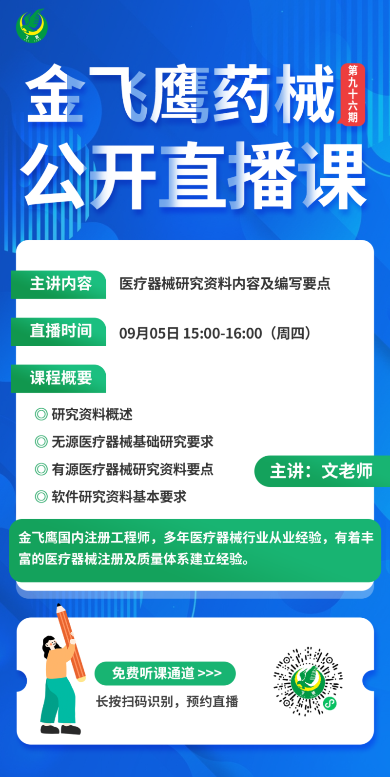 金飛鷹直播培訓(xùn),是每周一次的固定培訓(xùn)欄目,優(yōu)選金飛鷹國(guó)內(nèi)外資深注冊(cè)/項(xiàng)目老師定期為大家講解醫(yī)療器械注冊(cè)相關(guān)知識(shí),解答大家在醫(yī)療器械注冊(cè)過(guò)程中的諸多疑問(wèn)。