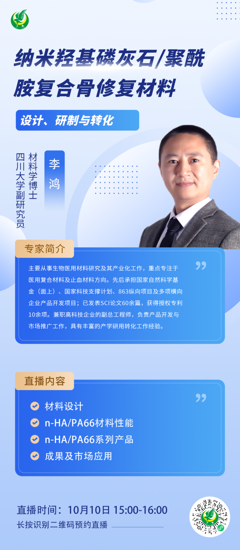 10月10日下午3點(diǎn),李老師給大家?guī)?lái)《納米羥基磷灰石/聚酰胺復(fù)合骨修復(fù)材料的設(shè)計(jì)、研制與轉(zhuǎn)化》,將從材料設(shè)計(jì)、材料性能、研究成果及市場(chǎng)應(yīng)用等方面給大家詳細(xì)介紹,對(duì)此類高分子材料感興趣的朋友千萬(wàn)不要錯(cuò)過(guò)了哦~