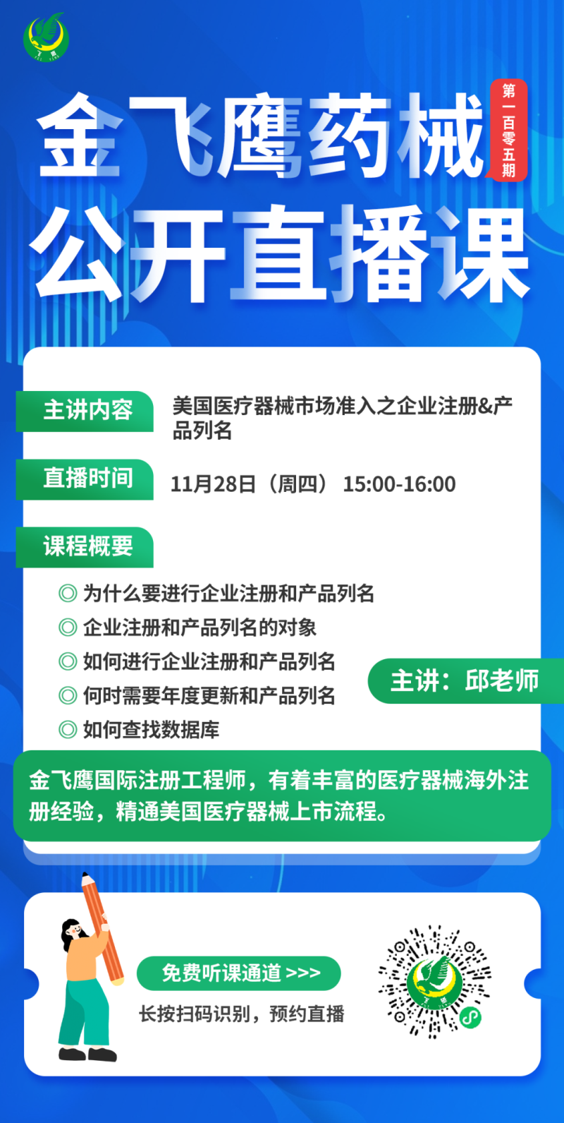 金飛鷹直播培訓(xùn),是每周一次的固定培訓(xùn)欄目,優(yōu)選金飛鷹國(guó)內(nèi)外資深注冊(cè)/項(xiàng)目老師定期為大家講解醫(yī)療器械注冊(cè)相關(guān)知識(shí),解答大家在醫(yī)療器械注冊(cè)過程中的諸多疑問。