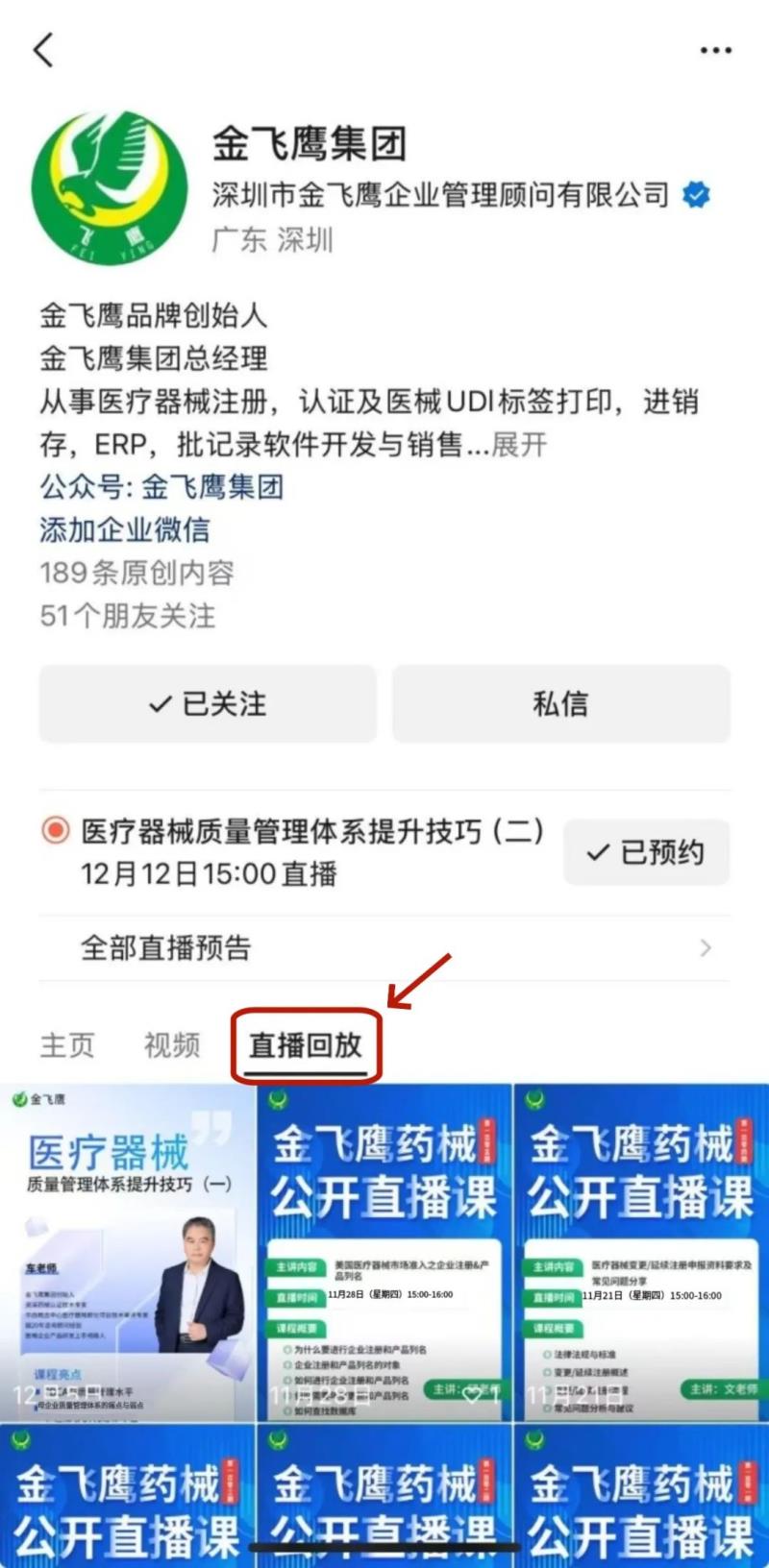 往期直播培訓課程支持回放,關(guān)注“金飛鷹藥械咨詢服務”視頻號并點擊視頻號主頁,即可查看“直播回放”哦~