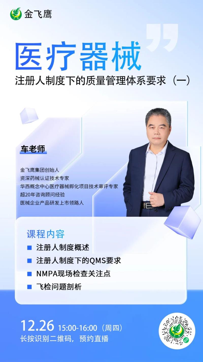 又是咱們金飛鷹集團創(chuàng)始人車號爽老師《醫(yī)療器械監(jiān)督管理條例》第三十四條明確規(guī)定:“醫(yī)療器械注冊人、備案人可以自行生產(chǎn)醫(yī)療器械,也可以委托符合本條例規(guī)定、具備相應條件的企業(yè)生產(chǎn)醫(yī)療器械?!?/span>這里提到的“委托生產(chǎn)”方式就是業(yè)內(nèi)常說的“注冊人制度”。因為此種方式涉及注冊人及生產(chǎn)商兩家企業(yè),國家對其監(jiān)管也更為嚴格,注冊人在選擇具備相應條件的企業(yè)作為受托方后,需與受托方簽訂《醫(yī)療器械委托生產(chǎn)質(zhì)量協(xié)議》,以明確各自在醫(yī)療器械生產(chǎn)過程中的責任分工和義務,最終確保醫(yī)械產(chǎn)品的安全有效。但是,通過近年來輔導的諸多委托生產(chǎn)案例我們發(fā)現(xiàn),很多醫(yī)療器械注冊人對企業(yè)質(zhì)量管理體系的重視不夠,以為委托出去便“萬事大吉”了,從而導致在現(xiàn)場檢查中體系不符合規(guī)定、委托方對受托方的審核監(jiān)管不到位、雙方職責不明確等問題層出不窮,因此我們策劃了本期課程,結(jié)合具體實例,給大家全面剖析醫(yī)療器械注冊人制度下的質(zhì)量管理體系要求。12月26日下午3點,金飛鷹集團創(chuàng)始人車號爽老師給大家?guī)怼夺t(yī)療器械注冊人制度下的質(zhì)量管理體系要求》,培訓內(nèi)容包括注冊人制度概述、注冊人制度下的QMS要求、NMPA現(xiàn)場檢查關(guān)注點、飛檢問題剖析,想聽課的朋友記得提前預約!