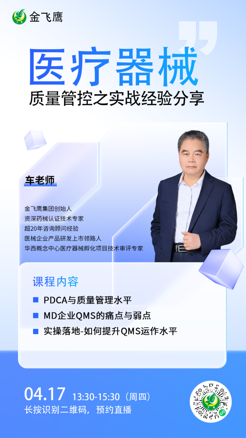 在此背景下,由金飛鷹、成都聯(lián)東U谷聯(lián)合主辦,成都高新區(qū)醫(yī)療器械創(chuàng)新轉化協(xié)會、動脈網(wǎng)成都數(shù)智醫(yī)療創(chuàng)新聯(lián)盟協(xié)會協(xié)辦的醫(yī)療器械質量管理與注冊申報實操經(jīng)驗分享的線下培訓,將于4月17日下午在成都溫江區(qū)聯(lián)東U谷·成都醫(yī)學城科技企業(yè)港30棟黨建活動中心舉辦。本次培訓聚焦“醫(yī)療器械質量工作日常管理技巧實操經(jīng)驗專題”和“醫(yī)療器械注冊申報技巧實操經(jīng)驗專題”兩大熱門主題,由金飛鷹集團創(chuàng)始人車號爽老師主導進行分享,他將結合金飛鷹輔導過的眾多成功案例,深入剖析醫(yī)療器械質量工作日常管理的實用技巧,為企業(yè)提供可落地的專業(yè)指導,提升企業(yè)的市場競爭力!