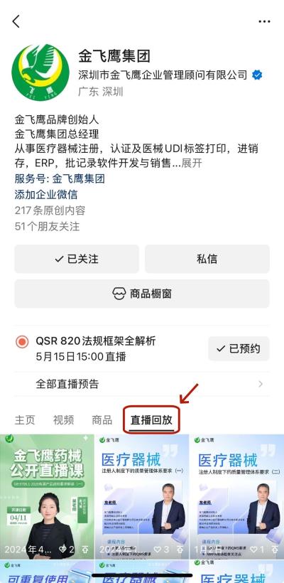 往期直播培訓(xùn)課程支持回放,關(guān)注“金飛鷹藥械咨詢服務(wù)”視頻號并點擊視頻號主頁,即可查看“直播回放”哦~