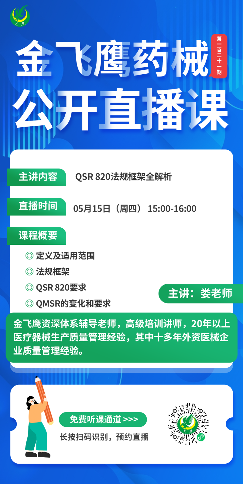 金飛鷹直播培訓(xùn),是每周一次的固定培訓(xùn)欄目,優(yōu)選金飛鷹國內(nèi)外資深注冊/項目老師定期為大家講解醫(yī)療器械注冊相關(guān)知識,解答大家在醫(yī)療器械注冊過程中的諸多疑問。