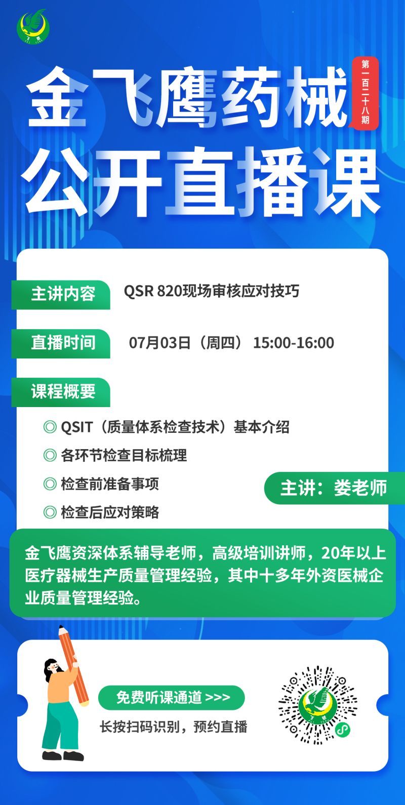 7月3日下午3點,金飛鷹資深體系輔導(dǎo)老師、有著十多年外資醫(yī)械企業(yè)質(zhì)量管理經(jīng)驗的婁老師給大家?guī)怼禥SR 820現(xiàn)場審核應(yīng)對技巧,他將從QSIT(質(zhì)量體系檢查技術(shù))的基本介紹出發(fā),深入解析FDA現(xiàn)場檢查的核心要點。在此基礎(chǔ)上,本次課程還將給出企業(yè)在檢查前檢查后準(zhǔn)備事項及應(yīng)對策略,為企業(yè)應(yīng)對FDA檢查打下堅實基礎(chǔ)。