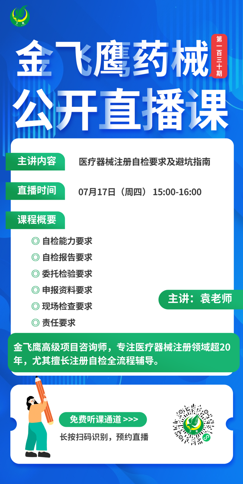 7月17日下午3點(diǎn),金飛鷹高級(jí)項(xiàng)目咨詢師,專注醫(yī)療器械注冊(cè)領(lǐng)域超20年,尤其擅長(zhǎng)注冊(cè)自檢全流程輔導(dǎo)的袁老師給大家?guī)?lái)《醫(yī)療器械注冊(cè)自檢要求及避坑指南》,在一一梳理注冊(cè)自檢各方面要求的同時(shí),還會(huì)結(jié)合過(guò)往的實(shí)際輔導(dǎo)案例給大家總結(jié)避坑指南及現(xiàn)場(chǎng)核查應(yīng)對(duì)策略,感興趣的朋友記得提前預(yù)約!