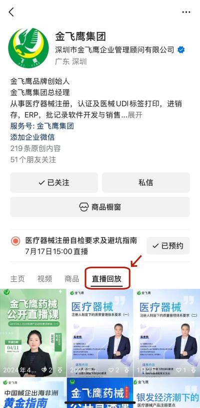 往期直播培訓(xùn)課程支持回放,關(guān)注“金飛鷹藥械咨詢服務(wù)”視頻號(hào)并點(diǎn)擊視頻號(hào)主頁(yè),即可查看“直播回放”哦~