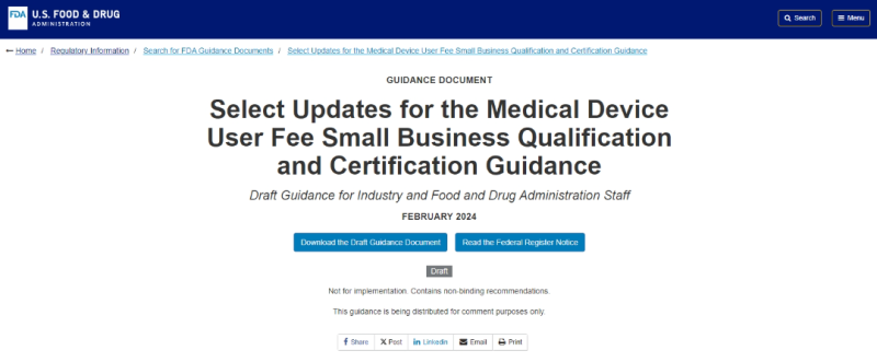 近日,F(xiàn)DA發(fā)布一份指南草案“Select Updates for the Medical Device User Fee Small Business Qualification and Certification Guidance”,提議對原有《醫(yī)療器械用戶費用、小企業(yè)資格和認(rèn)證》指南文件進(jìn)行更新。