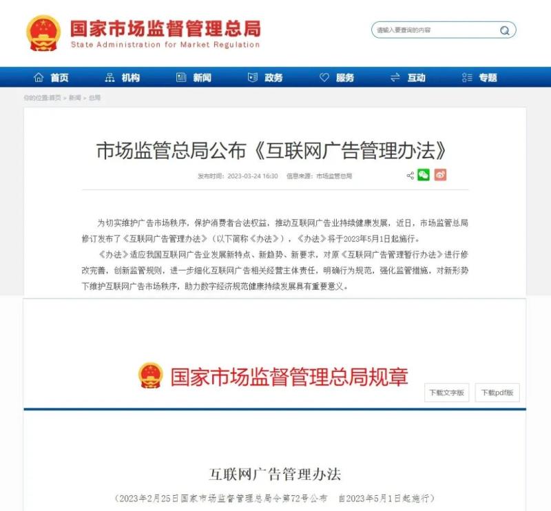 近日,國(guó)家市場(chǎng)監(jiān)管總局修訂發(fā)布了《互聯(lián)網(wǎng)廣告管理辦法》(以下簡(jiǎn)稱《辦法》),并將于2023年5月1日起正式施行,此前2016年發(fā)布的《互聯(lián)網(wǎng)廣告管理暫行辦法》將同時(shí)廢止。