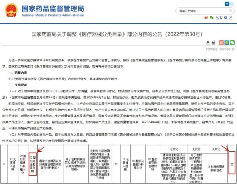事實上,我們之前也跟大家科普過,國家藥監(jiān)局早在2022年3月就發(fā)布了《關于調整〈醫(yī)療器械分類目錄〉部分內容的公告(2022年第30號)》,其中明確提到“整形用注射填充物”為監(jiān)管級別最高的第三類醫(yī)療器械,需嚴格按照《醫(yī)療器械注冊與備案管理辦法》等進行醫(yī)療器械注冊申請。