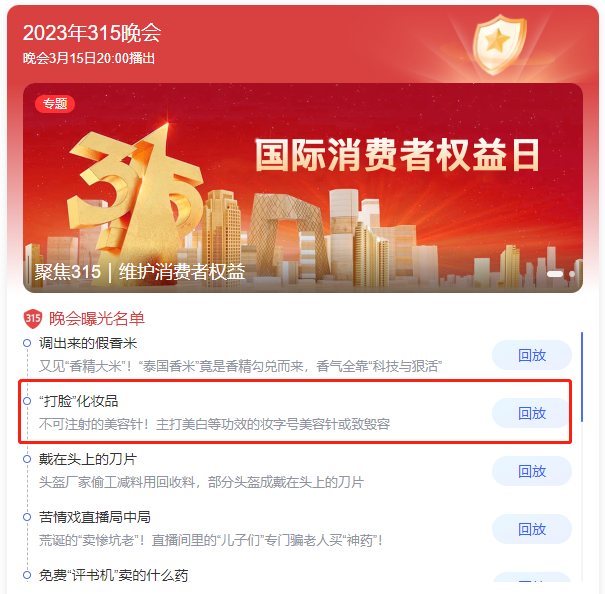 相信大家已有所了解,本年度315晚會被曝光的名單有假香米、美容針、安全頭盔……這其中有一個我們十分熟悉的產(chǎn)品——美容針。