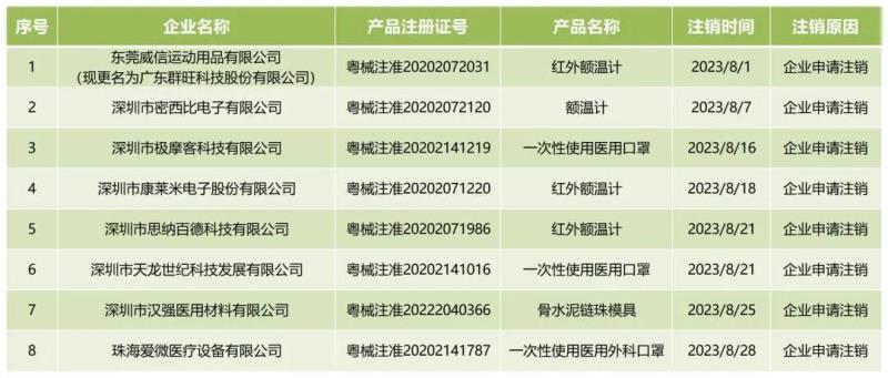 近日,廣東省藥監(jiān)局官網(wǎng)發(fā)布通告稱,該局已依法注銷“粵械注準20202072031”8個醫(yī)療器械注冊證,包括深圳市極摩客科技有限公司的一次性使用醫(yī)用口罩、深圳市康萊米電子股份有限公司的紅外額溫計、深圳市漢強醫(yī)用材料有限公司的骨水泥鏈珠模具等產(chǎn)品,具體明細如下: