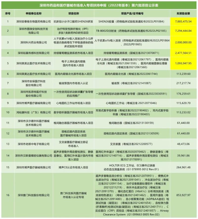 近日,深圳市發(fā)展和改革委員會官網(wǎng)發(fā)布《深圳市藥品和醫(yī)療器械市場準(zhǔn)入專項扶持申報(2022年版本)第六批擬資助項目的公示》,包括深圳市貝斯曼精密儀器有限公司的超聲多普勒外周血管檢測儀/靜脈顯像儀/醫(yī)用紅外體溫計國內(nèi)市場準(zhǔn)入項目、深圳市沃爾德外科醫(yī)療器械技術(shù)有限公司的椎間融合器/頸椎后路內(nèi)固定系統(tǒng)醫(yī)療器械市場準(zhǔn)入項目、深圳市老郎中電子有限公司的艾灸裝置醫(yī)療器械注冊證市場準(zhǔn)入等在內(nèi)的共計16個項目,其中擬資助金額最高為788萬余元,而100萬元以上的共有5個項目(已用黃色標(biāo)注),具體明細(xì)如下: