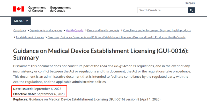 9月6日,加拿大更新了與醫(yī)療器械企業(yè)許可證(Medical Device Eestablishment Licensing)相關(guān)的監(jiān)管要求指南文件。