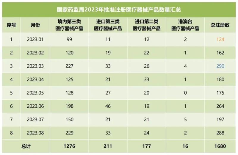 我們同步匯總了2023年各個月份國家藥監(jiān)局批準注冊的醫(yī)療器械產(chǎn)品數(shù)量(見下方表格),從表格中可以看出,截至8月,2023年國家藥監(jiān)局總計批準注冊醫(yī)療器械產(chǎn)品1680個,其中境內(nèi)第三類醫(yī)療器械產(chǎn)品1276個,進口第三類醫(yī)療器械產(chǎn)品211個(第三類醫(yī)療器械產(chǎn)品總計1487個),進口第二類醫(yī)療器械產(chǎn)品177個,港澳臺醫(yī)療器械產(chǎn)品16個。