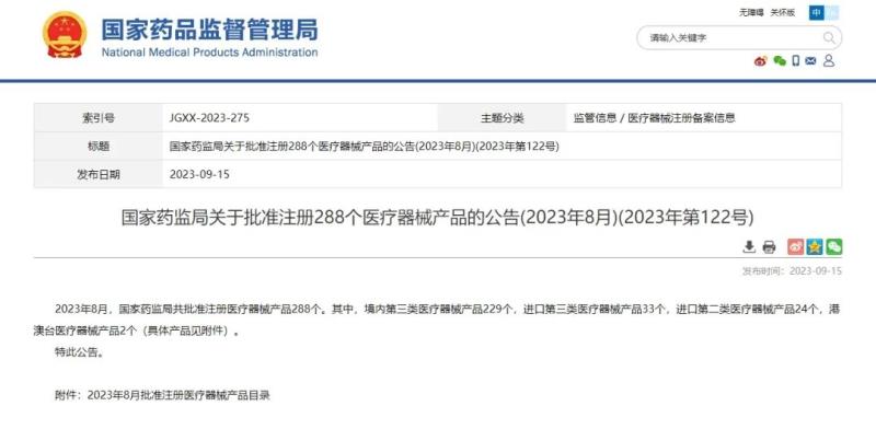 據(jù)國家藥監(jiān)局官網(wǎng)近日發(fā)布,2023年8月,國家藥監(jiān)局共批準注冊醫(yī)療器械產(chǎn)品288個。其中,境內(nèi)第三類醫(yī)療器械產(chǎn)品229個,進口第三類醫(yī)療器械產(chǎn)品33個,進口第二類醫(yī)療器械產(chǎn)品24個,港澳臺醫(yī)療器械產(chǎn)品2個。