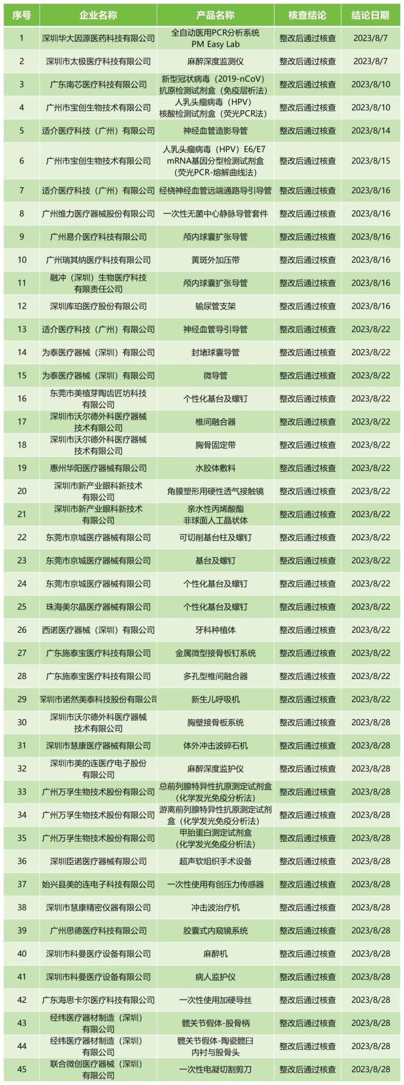 9月18日,廣東省藥監(jiān)局官網(wǎng)公布2023年8月醫(yī)療器械注冊質量管理體系核查結果,包括深圳市沃爾德外科醫(yī)療器械技術有限公司、廣州萬孚生物技術股份有限公司、深圳市科曼醫(yī)療設備有限公司在內的32家公司共計45款產品,均為“整改后通過核查”。具體明細見下方表格: