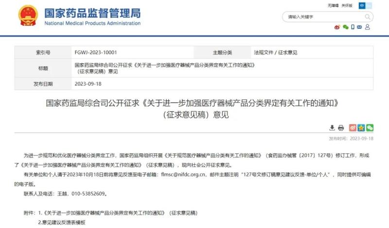 9月18日,國(guó)家藥監(jiān)局官網(wǎng)發(fā)布《關(guān)于進(jìn)一步加強(qiáng)醫(yī)療器械產(chǎn)品分類界定有關(guān)工作的通知(征求意見稿)》(以下簡(jiǎn)稱《通知》),并向社會(huì)公開征求意見。