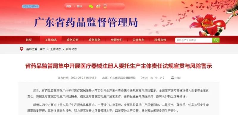 9月21日,廣東藥監(jiān)局官網(wǎng)發(fā)布動態(tài)稱,近日,該局在廣州舉行醫(yī)療器械注冊人落實委托生產(chǎn)主體責(zé)任集中法規(guī)宣貫與風(fēng)險警示,全面落實醫(yī)療器械注冊人質(zhì)量安全主體責(zé)任,防控醫(yī)療器械委托生產(chǎn)風(fēng)險隱患,強化醫(yī)療器械委托生產(chǎn)監(jiān)管工作。