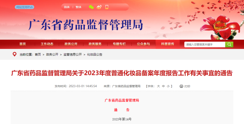 3月1日,廣東省藥監(jiān)局官網(wǎng)發(fā)布《關(guān)于2023年度普通化妝品備案年度報(bào)告工作有關(guān)事宜的通告》,其中指出,自2022年1月1日起,普通化妝品備案人應(yīng)當(dāng)于每年1月1日至3月31日期間,通過新注冊備案平臺(tái),提交備案時(shí)間滿一年普通化妝品的年度報(bào)告。2023年度備案年度報(bào)告工作已于2023年1月1日開始,將于2023年3月31日結(jié)束。2021年12月31日前備案的產(chǎn)品應(yīng)當(dāng)開展2023年度備案年度報(bào)告工作。