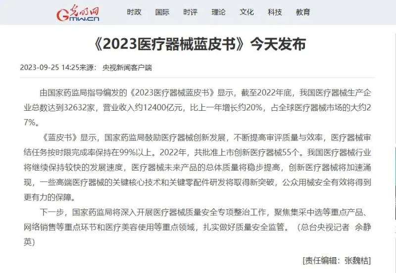 近日,由國家藥監(jiān)局指導編發(fā)的《2023 醫(yī)療器械藍皮書》顯示,截至 2022 年底,我國醫(yī)療器械生產(chǎn)企業(yè)總數(shù)達到 32632 家,營業(yè)收入約 12400 億元,比上一年增長約 20%,占全球醫(yī)療器械市場的大約 27%。