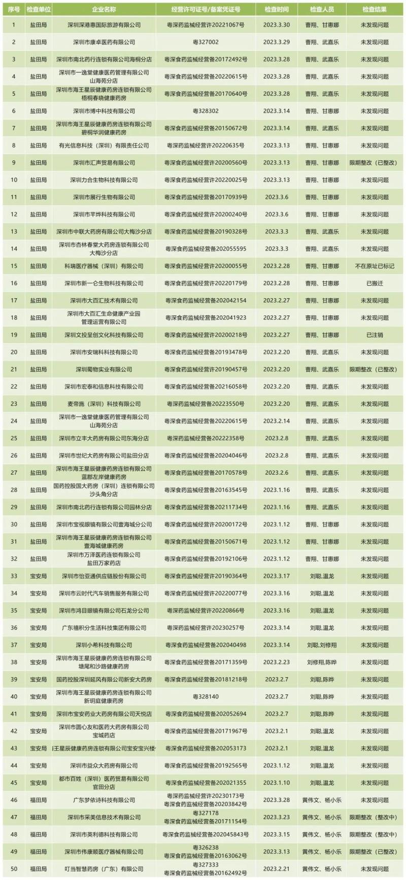 4月13日,深圳市市場監(jiān)督管理局官網(wǎng)公布醫(yī)療器械經(jīng)營企業(yè)監(jiān)督檢查結(jié)果(2023年第二期),共對318家醫(yī)療器械經(jīng)營企業(yè)進(jìn)行了監(jiān)督檢查,其中有11家需要整改,具體如下: