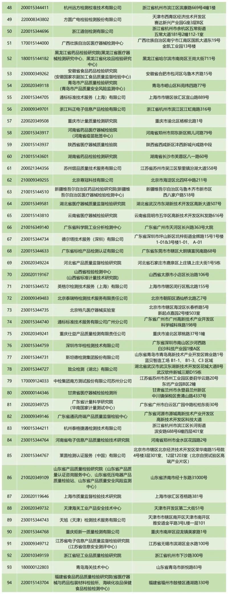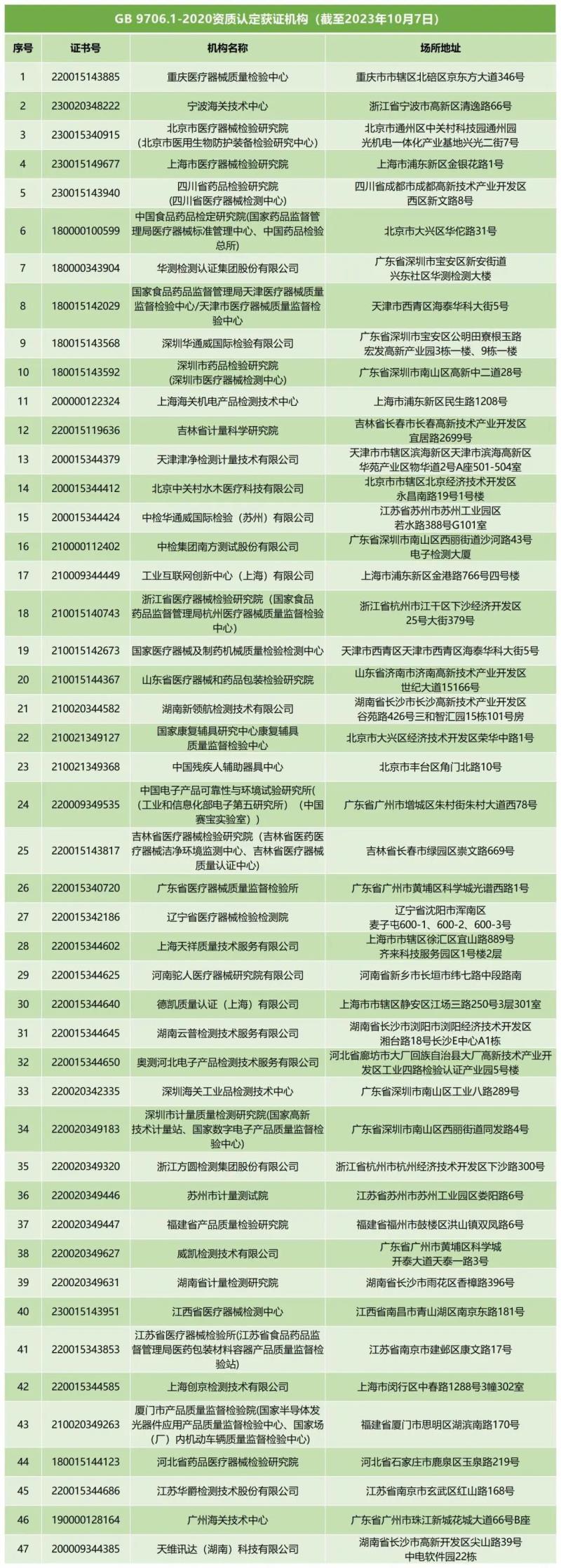近日,中檢院官網(wǎng)公布了截至2023年10月7日,75個(gè)新版GB 9706系列標(biāo)準(zhǔn)檢驗(yàn)資質(zhì)認(rèn)定情況和GB 9706.1-2020、YY 9706.102-2021獲證機(jī)構(gòu)信息。我們從附件表格中可以看到,全國共有94家(比9月新增2家)GB 9706.1-2020資質(zhì)認(rèn)定獲證機(jī)構(gòu),也就是說,可以承擔(dān)新標(biāo)的安規(guī)檢測(cè)工作,具體如下: