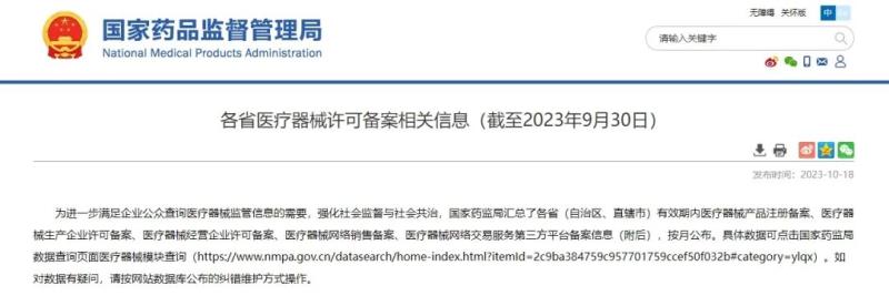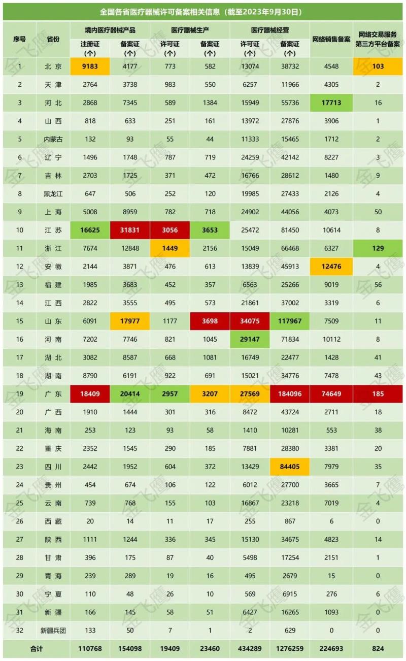 10月18日,國家藥監(jiān)局公布了截至2023年9月30日各省有效期內(nèi)醫(yī)療器械產(chǎn)品注冊(cè)備案、醫(yī)療器械生產(chǎn)企業(yè)許可備案等信息,老規(guī)矩,金飛鷹小編對(duì)此稍作編輯,標(biāo)注紅色、綠色、黃色的分別為前三甲。