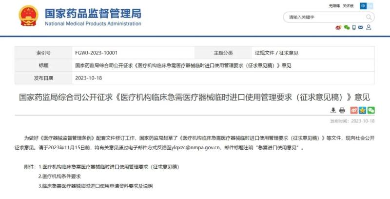 10月18日,國家藥監(jiān)局官網(wǎng)發(fā)布《醫(yī)療機(jī)構(gòu)臨床急需醫(yī)療器械臨時(shí)進(jìn)口使用管理要求(征求意見稿)》(以下簡稱《管理要求》),并向社會公開征求意見。
