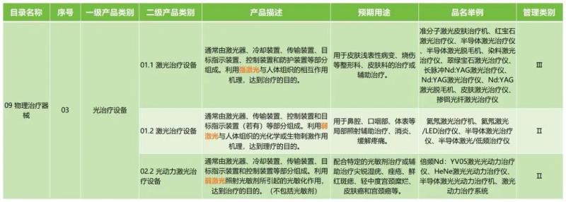 首先,用于醫(yī)美用途的激光產(chǎn)品都屬于《醫(yī)療器械分類目錄》子目錄“09 物理治療器械,其分類編碼為09-03-01及09-03-02。激光醫(yī)美產(chǎn)品產(chǎn)品描述、預(yù)期用途如下: