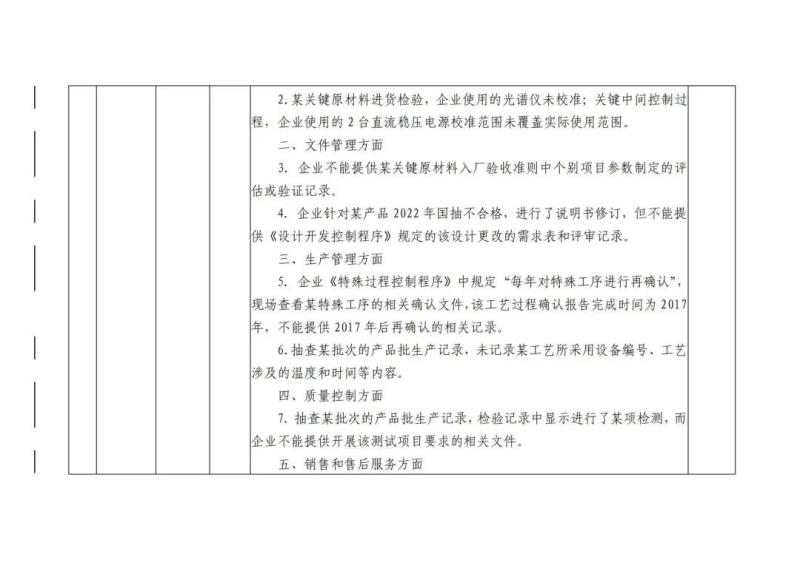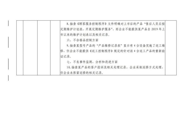 8. 抽查《顧客服務(wù)控制程序》文件明確對(duì)上市后的產(chǎn)品“售后人員應(yīng)按定期維護(hù)計(jì)劃表,開(kāi)展定期維護(hù)服務(wù)”,而企業(yè)不能提供某產(chǎn)品自2019年上市以來(lái)的維護(hù)計(jì)劃表以及相關(guān)記錄。