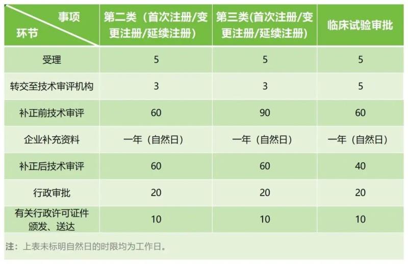 具體來說,第三類醫(yī)械產(chǎn)品的注冊(cè)申報(bào)時(shí)間是要長于第二類醫(yī)療器械的,以下為國家藥監(jiān)局器審中心發(fā)布的法定時(shí)限表: