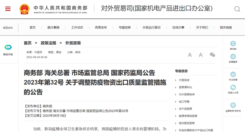 自本公告發(fā)布之日起,商務(wù)部、海關(guān)總署、國家藥監(jiān)局2020年第5號公告(《關(guān)于有序開展防疫物資出口的公告》)及商務(wù)部、海關(guān)總署、市場監(jiān)管總局2020年第12號公告(《關(guān)于進(jìn)一步加強(qiáng)防疫物資出口質(zhì)量監(jiān)管的公告》)同時(shí)廢止。有關(guān)防疫物資出口企業(yè)要確保產(chǎn)品質(zhì)量安全、符合相關(guān)標(biāo)準(zhǔn)要求,自覺維護(hù)中國產(chǎn)品國際聲譽(yù)。