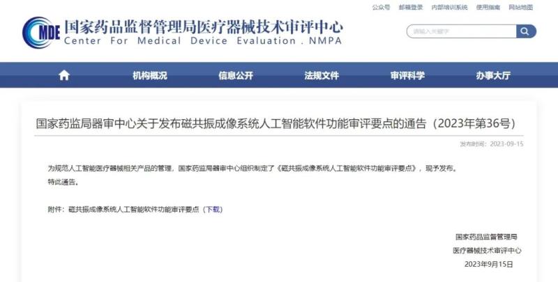 近日,國家藥監(jiān)局器審中心官網(wǎng)發(fā)布《磁共振成像系統(tǒng)人工智能軟件功能審評要點》(以下簡稱《審評要點》),我們將其中重點內(nèi)容摘錄如下: