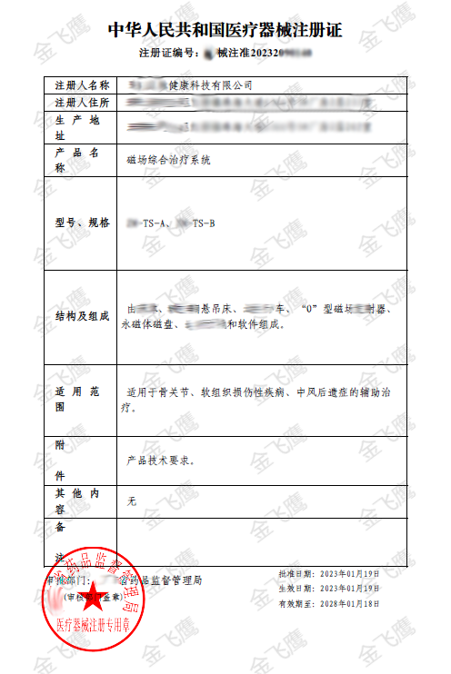 前些天我們跟大家分享了穴位磁療貼的成功案例,接上期內(nèi)容,今天的主角依然是磁療,產(chǎn)品則是更為復(fù)雜的磁場綜合治療系統(tǒng)。前段時(shí)間,金飛鷹輔導(dǎo)一家企業(yè)成功取得了磁場綜合治療系統(tǒng)的注冊證,如下圖?