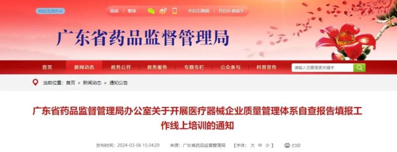 近日,廣東省藥監(jiān)局發(fā)布《關(guān)于開展醫(yī)療器械企業(yè)質(zhì)量管理體系自查報(bào)告填報(bào)工作線上培訓(xùn)的通知》,其中指出,凡2023年12月31日前登記注冊的醫(yī)療器械注冊人、備案人、受托生產(chǎn)企業(yè)、進(jìn)口醫(yī)療器械代理人,都應(yīng)當(dāng)對質(zhì)量管理體系運(yùn)行情況進(jìn)行自查,通過廣東省智慧藥監(jiān)企業(yè)專屬網(wǎng)頁提交2023年度質(zhì)量管理體系自查報(bào)告。