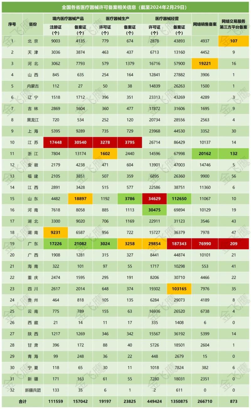 3月12日,國家藥監(jiān)局公布了截至2024年2月29日各省有效期內(nèi)醫(yī)療器械產(chǎn)品注冊備案、醫(yī)療器械生產(chǎn)企業(yè)許可備案等信息,老規(guī)矩,金飛鷹小編對此稍作編輯,標(biāo)注紅色、綠色、黃色的分別為前三甲。