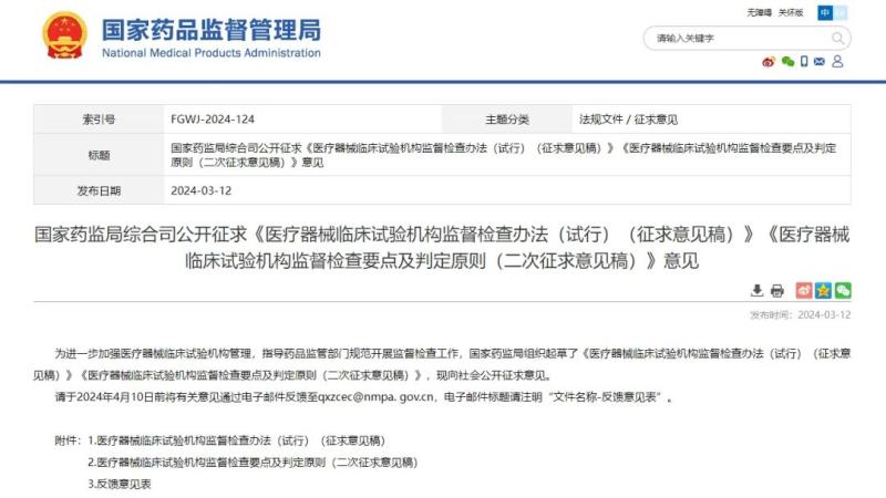 3月12日,國家藥監(jiān)局發(fā)布《醫(yī)療器械臨床試驗機構(gòu)監(jiān)督檢查辦法(試行)(征求意見稿)》《醫(yī)療器械臨床試驗機構(gòu)監(jiān)督檢查要點及判定原則(二次征求意見稿)》,并向社會公開征求意見。