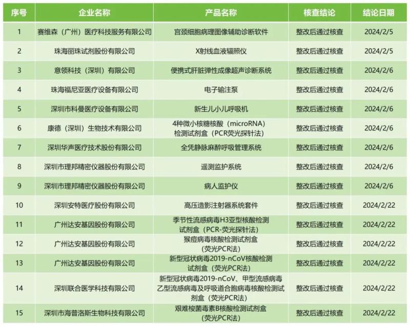 近日,廣東省藥監(jiān)局官網(wǎng)公布2024年2月醫(yī)療器械注冊質(zhì)量管理體系核查結(jié)果,包括廣州達安基因股份有限公司、深圳市科曼醫(yī)療設(shè)備有限公司、深圳市理邦精密儀器股份有限公司在內(nèi)的12家企業(yè)共計15款產(chǎn)品,均為“整改后通過核查”。具體明細見下方表格: