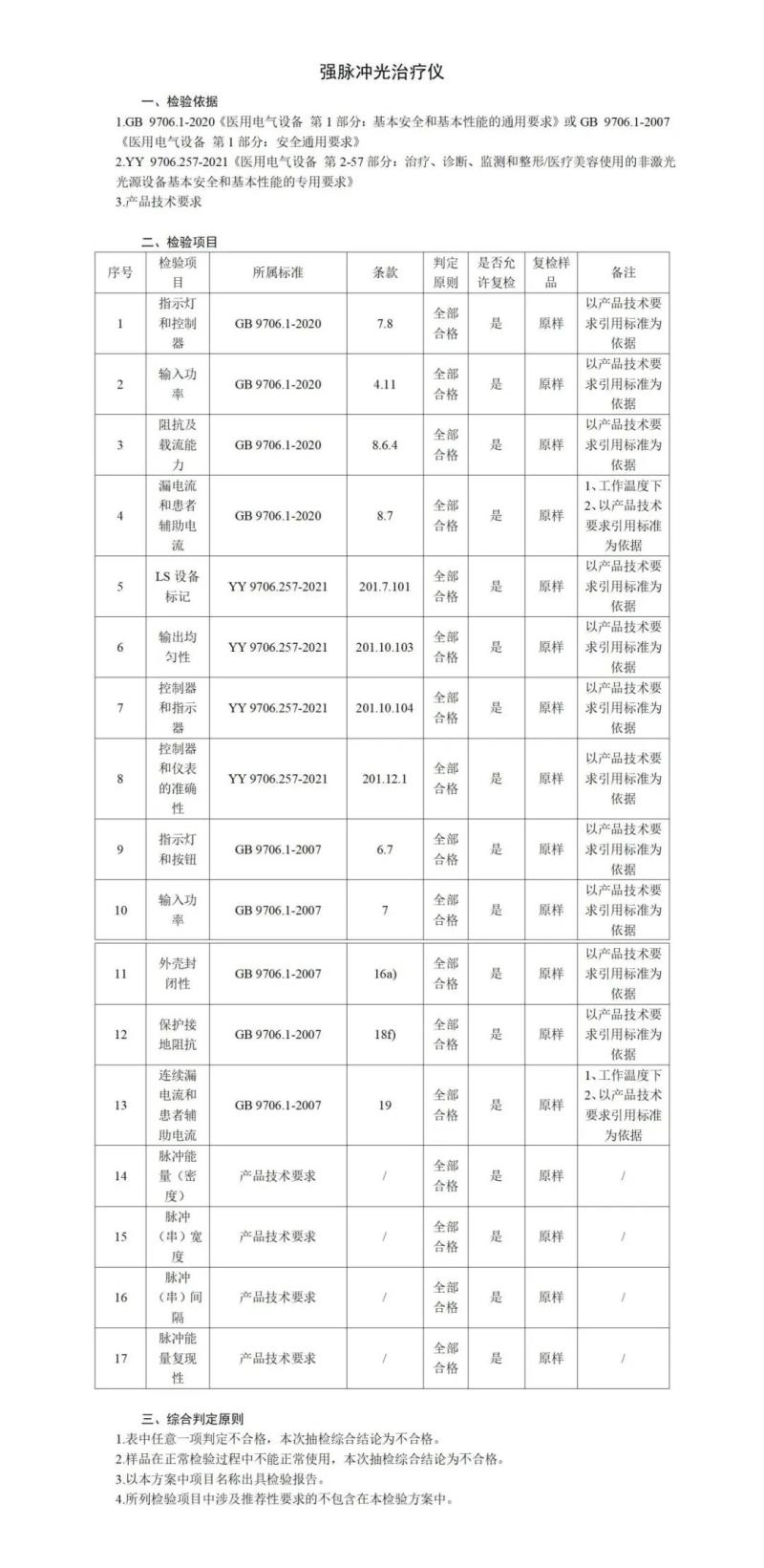 其中針對強脈沖光治療儀,國家藥監(jiān)局共提出了漏電流和患者輔助電流、LS設備標記、輸出均勻性、脈沖(串)寬度、脈沖(串)間隔等17個檢驗項目,同時指出,任意一項判定不合格,抽檢綜合結論即為不合格。具體如下: