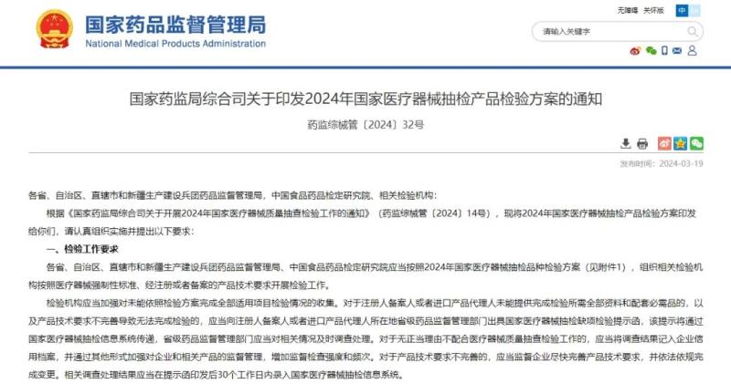 3月19日,國家藥監(jiān)局官網(wǎng)發(fā)布《2024年國家醫(yī)療器械抽檢產(chǎn)品檢驗方案》,強脈沖光治療儀、醫(yī)用脈搏血氧儀、醫(yī)用分子篩制氧機、超聲治療設備、水膠體敷料等66個品種被納入抽檢品種名單。