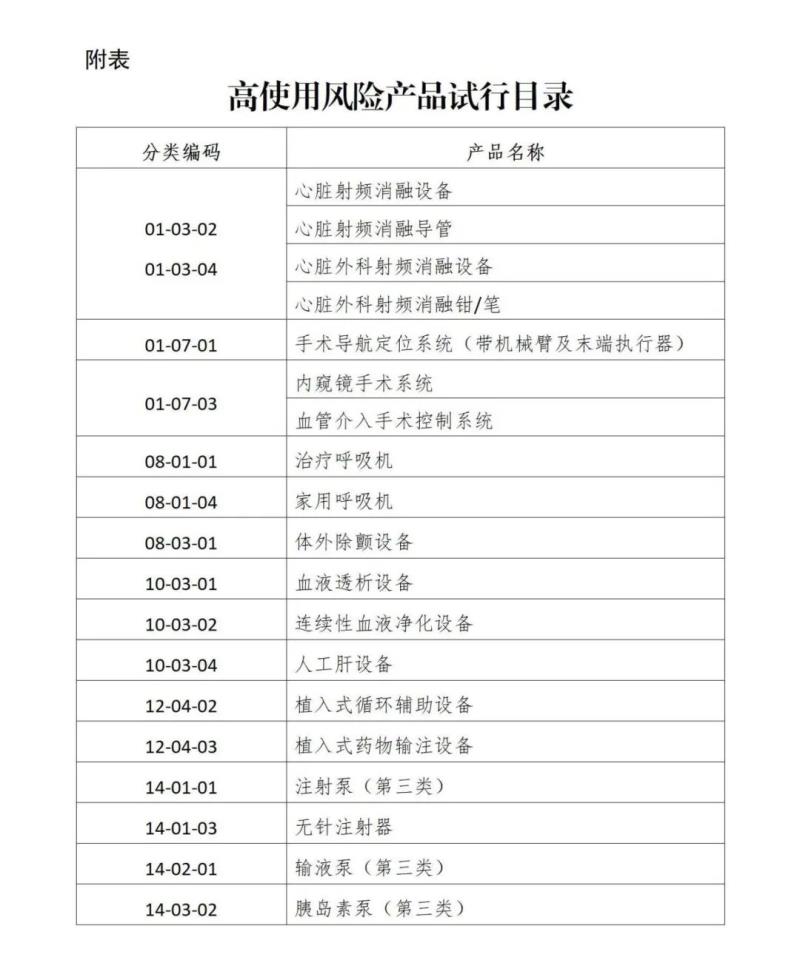 一、對于擬申請注冊的醫(yī)療器械產(chǎn)品,高使用風(fēng)險醫(yī)療器械按照目錄(詳見附件,均為第三類醫(yī)療器械)管理,列入目錄的產(chǎn)品提交可用性工程研究報告。對于其余第二、三類醫(yī)療器械,若相應(yīng)產(chǎn)品指導(dǎo)原則有可用性或可用性相關(guān)要求(如模擬使用等),則按其要求提交相應(yīng)注冊申報資料;其他情況均按照中、低使用風(fēng)險醫(yī)療器械要求提交使用錯誤評估報告