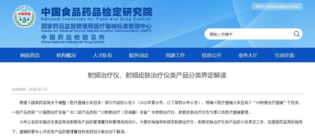 隨著這一監(jiān)管日期的臨近,3月27日,國家藥監(jiān)局醫(yī)療器械標準管理中心對射頻治療儀、射頻皮膚治療儀類產(chǎn)品的管理屬性和類別劃分做出解讀,具體如下: