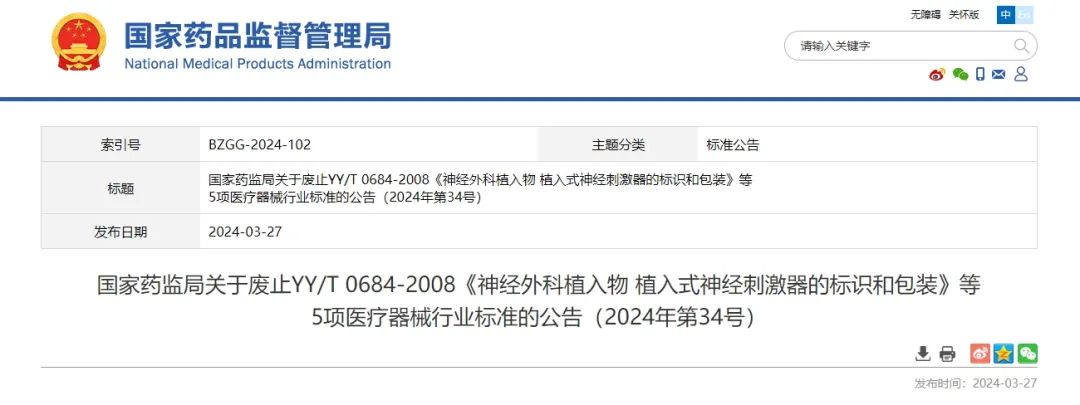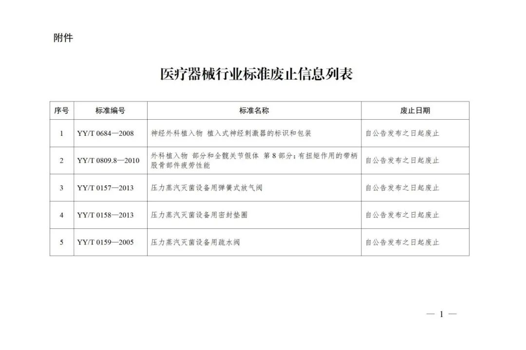 3月27日,國(guó)家藥監(jiān)局發(fā)布公告稱(chēng),廢止YY/T 0684-2008《神經(jīng)外科植入物 植入式神經(jīng)刺激器的標(biāo)識(shí)和包裝》、YY/T 0157-2013《壓力蒸汽滅菌設(shè)備用彈簧式放氣閥》等5項(xiàng)醫(yī)療器械行業(yè)標(biāo)準(zhǔn),具體明細(xì)如下;