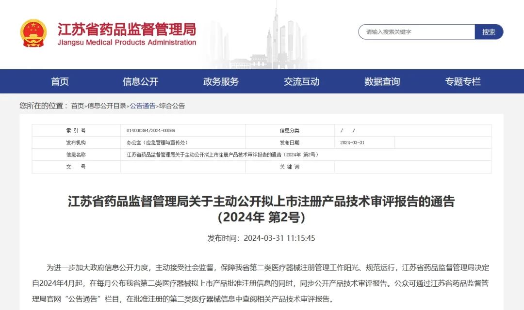 近日,江蘇省藥監(jiān)局發(fā)布通告稱,自2024年4月起,在每月公布江蘇省第二類醫(yī)療器械擬上市產(chǎn)品批準(zhǔn)注冊(cè)信息的同時(shí),同步公開產(chǎn)品技術(shù)審評(píng)報(bào)告。公眾可通過(guò)江蘇省藥品監(jiān)督管理局官網(wǎng)“公告通告”欄目,在批準(zhǔn)注冊(cè)的第二類醫(yī)療器械信息中查閱相關(guān)產(chǎn)品技術(shù)審評(píng)報(bào)告。