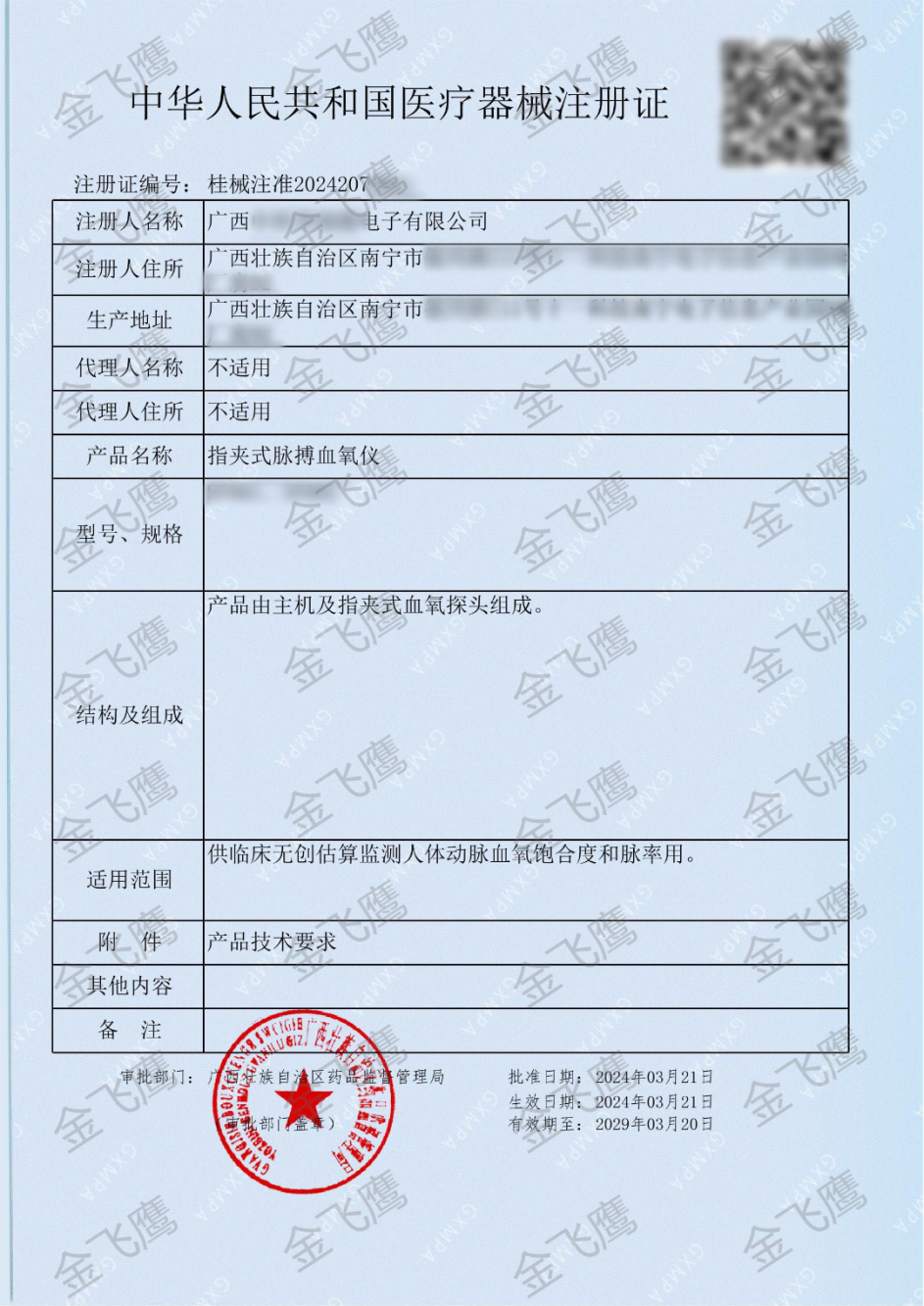近日,金飛鷹成功輔導(dǎo)廣西一家企業(yè)取得了【指夾式脈搏血氧儀】的注冊(cè)證,借此機(jī)會(huì),我們又給大家?guī)硪徊ㄑ鮾x產(chǎn)品的注冊(cè)干貨。