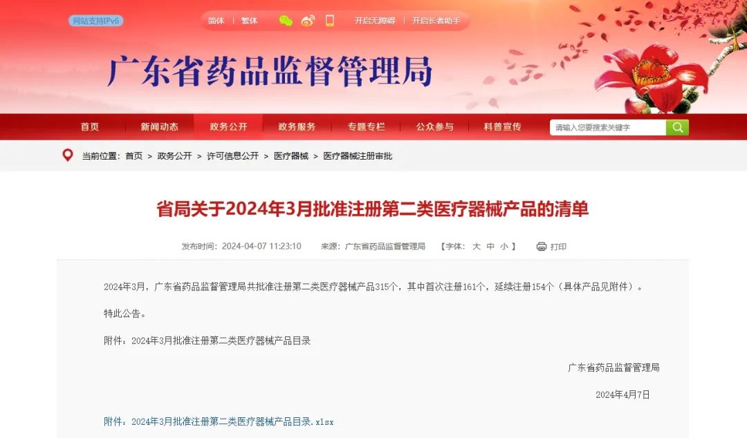 4月7日,廣東省藥監(jiān)局發(fā)布公告稱,2024年3月,廣東省藥監(jiān)局共批準(zhǔn)注冊(cè)醫(yī)療器械產(chǎn)品315個(gè),其中首次注冊(cè)161個(gè),延續(xù)注冊(cè)154個(gè)。