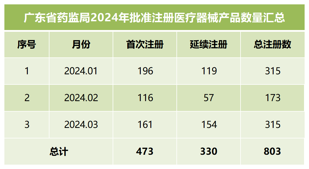 我們同步匯總了2024年第一季度廣東省藥監(jiān)局批準(zhǔn)注冊(cè)的醫(yī)療器械產(chǎn)品數(shù)量(見(jiàn)下方表格),從表格中可以看出,截至3月底,2024年廣東省藥監(jiān)局總計(jì)批準(zhǔn)注冊(cè)第二類醫(yī)療器械產(chǎn)品803個(gè),其中首次注冊(cè)473個(gè),延續(xù)注冊(cè)330個(gè)。