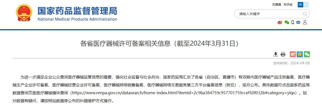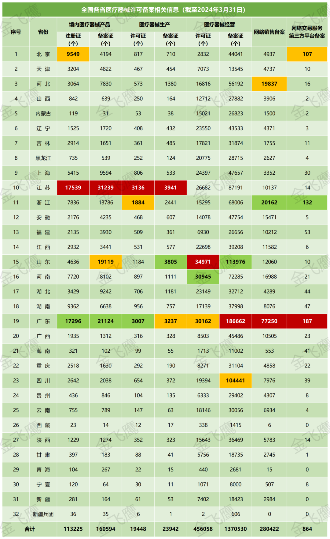 4月8日,國(guó)家藥監(jiān)局公布了截至2024年3月31日各省有效期內(nèi)醫(yī)療器械產(chǎn)品注冊(cè)備案、醫(yī)療器械生產(chǎn)企業(yè)許可備案等信息,老規(guī)矩,金飛鷹小編對(duì)此稍作編輯,標(biāo)注紅色、綠色、黃色的分別為前三甲。